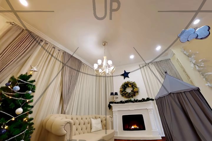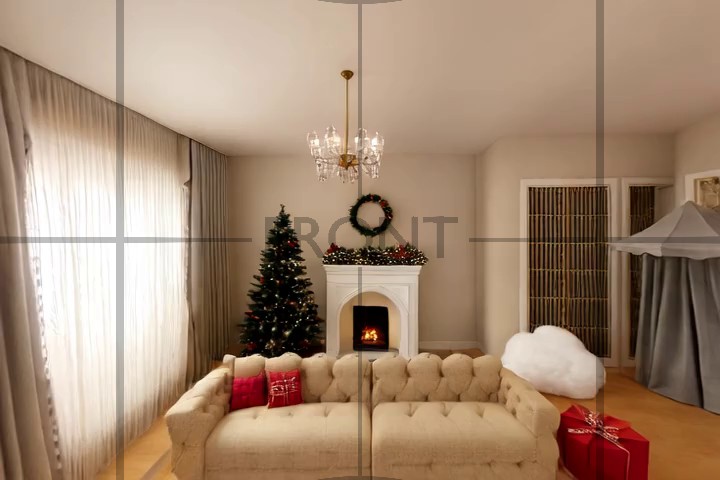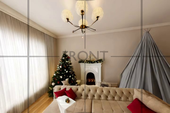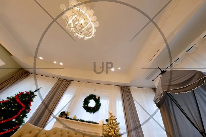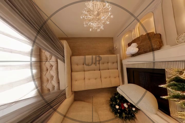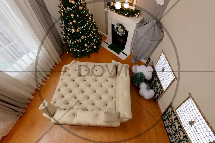 Caption: The video begins with a view of a modern, spacious living room featuring a sleek glass coffee table, a black floor lamp, and a brown sofa. The room is well-lit with natural light streaming through large windows, and a balcony with a white railing is visible above. In the background, a dining area with red chairs and a round table is partially visible. The camera slowly pans across the room, highlighting the minimalist decor and architectural details, including a large framed picture on the wall. As the camera moves, it reveals more of the room's features, such as a black spherical light fixture on the coffee table and a chessboard set on a stand. The video maintains a static view, focusing on the room's interior design and layout. Looking down, we see a glass bowl with apples on a table.