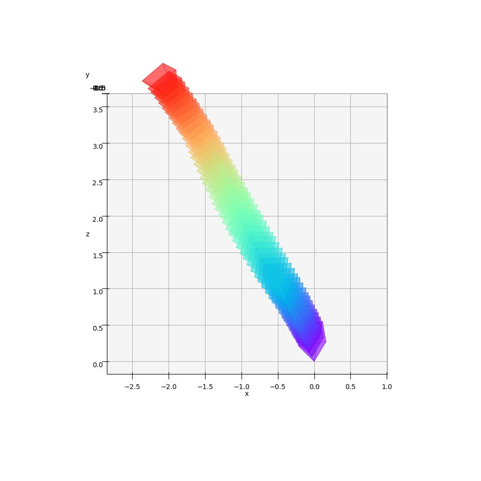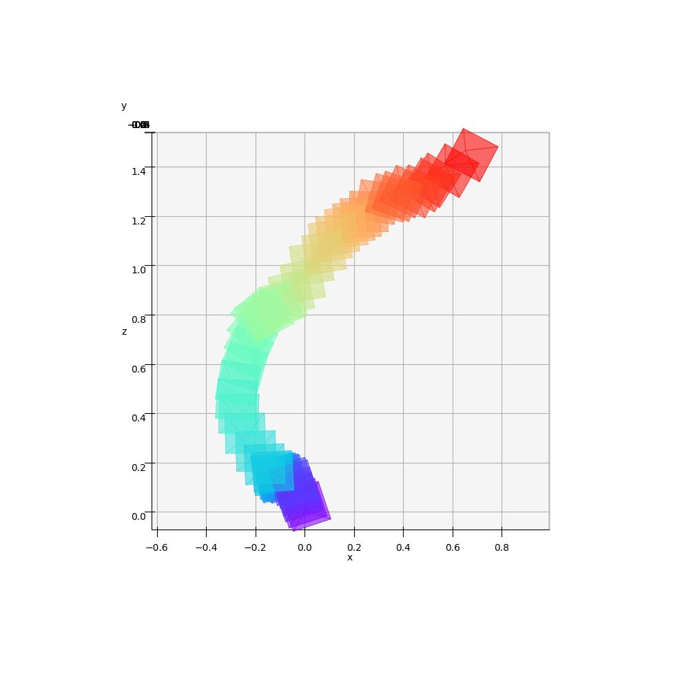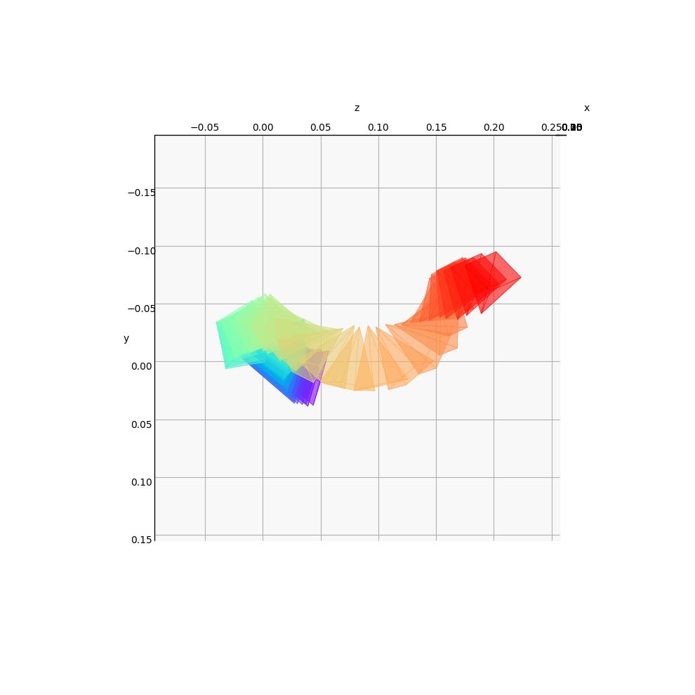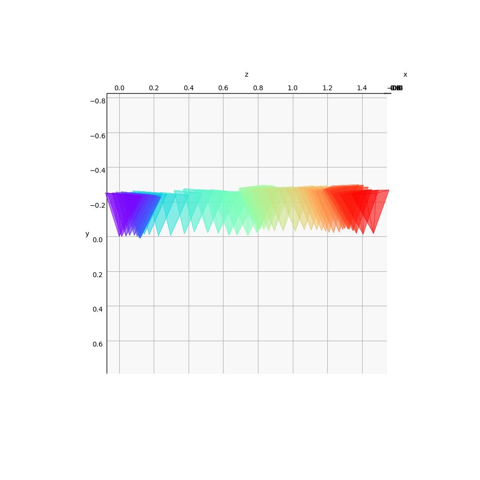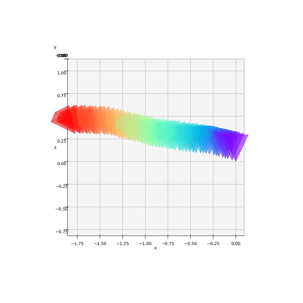 The cameras are color-coded to represent their position in time: the first camera is purple and the last one is red.