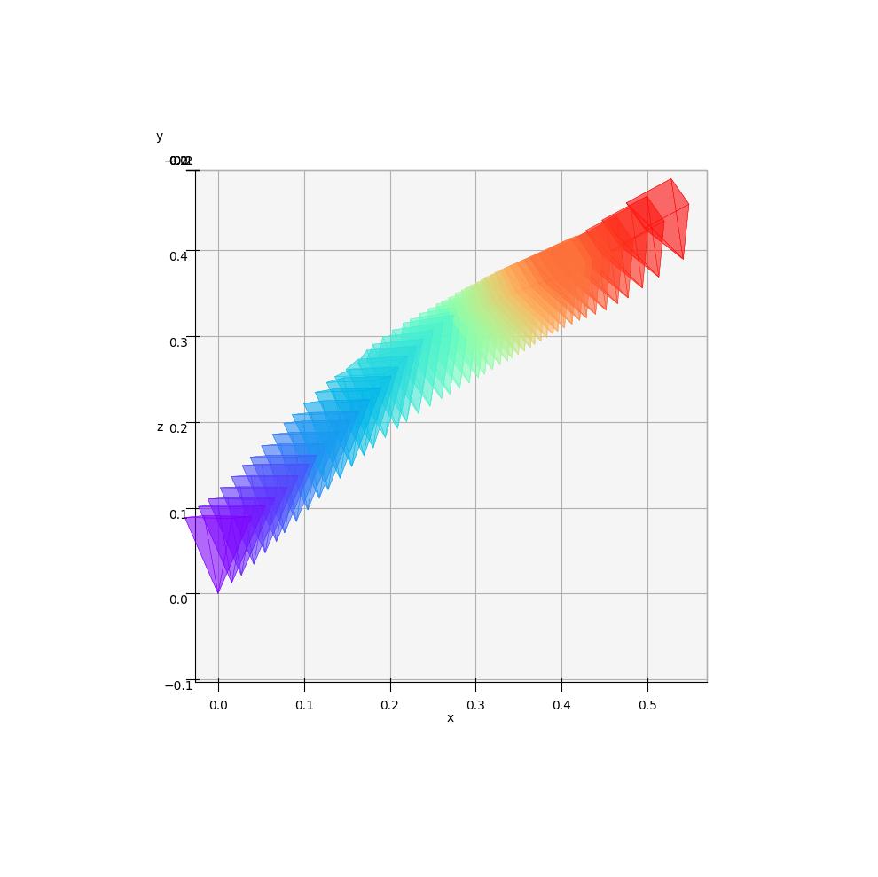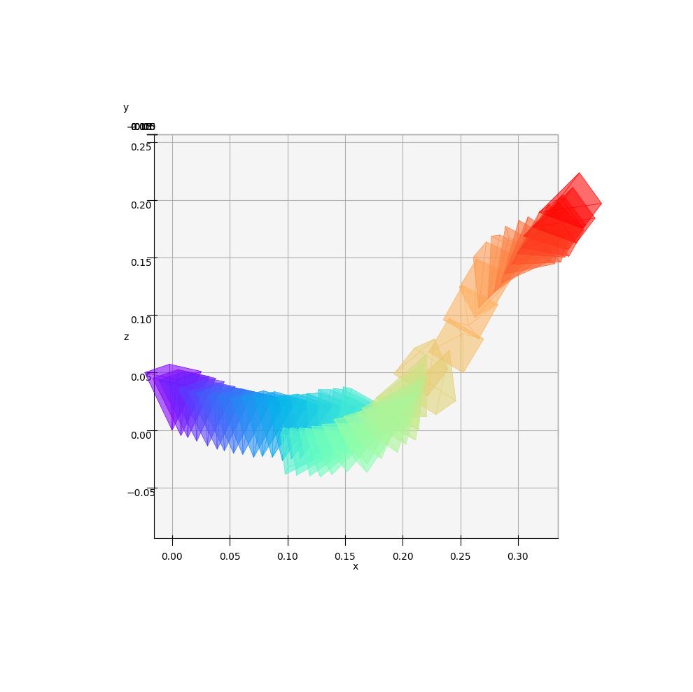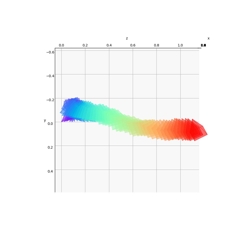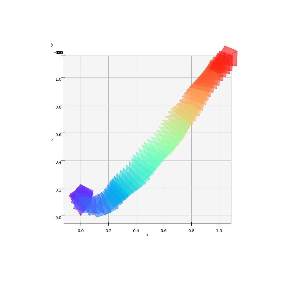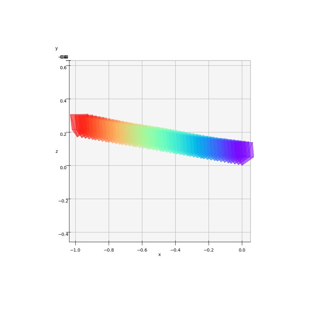 The cameras are color-coded to represent their position in time: the first camera is purple and the last one is red.