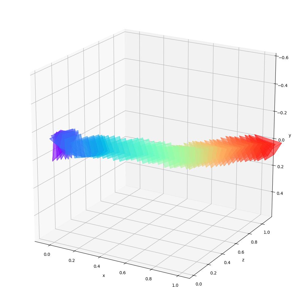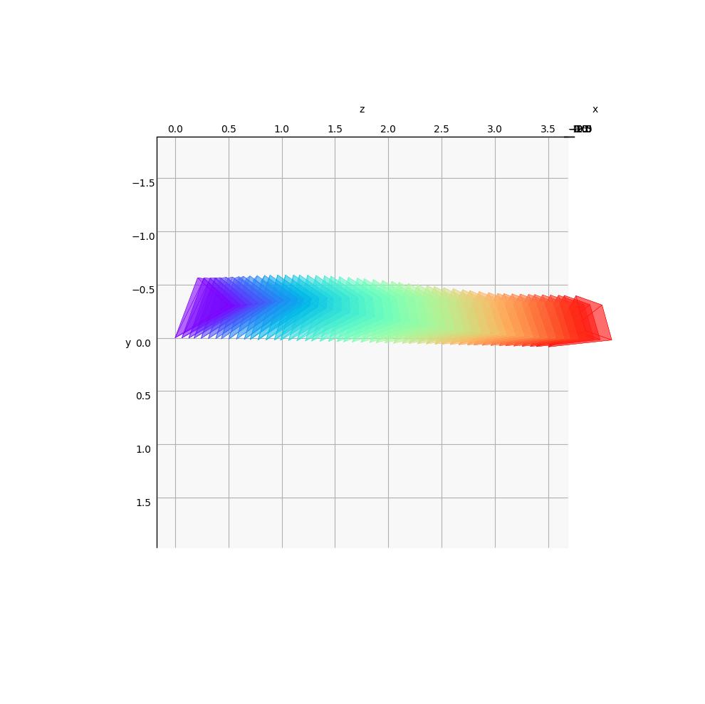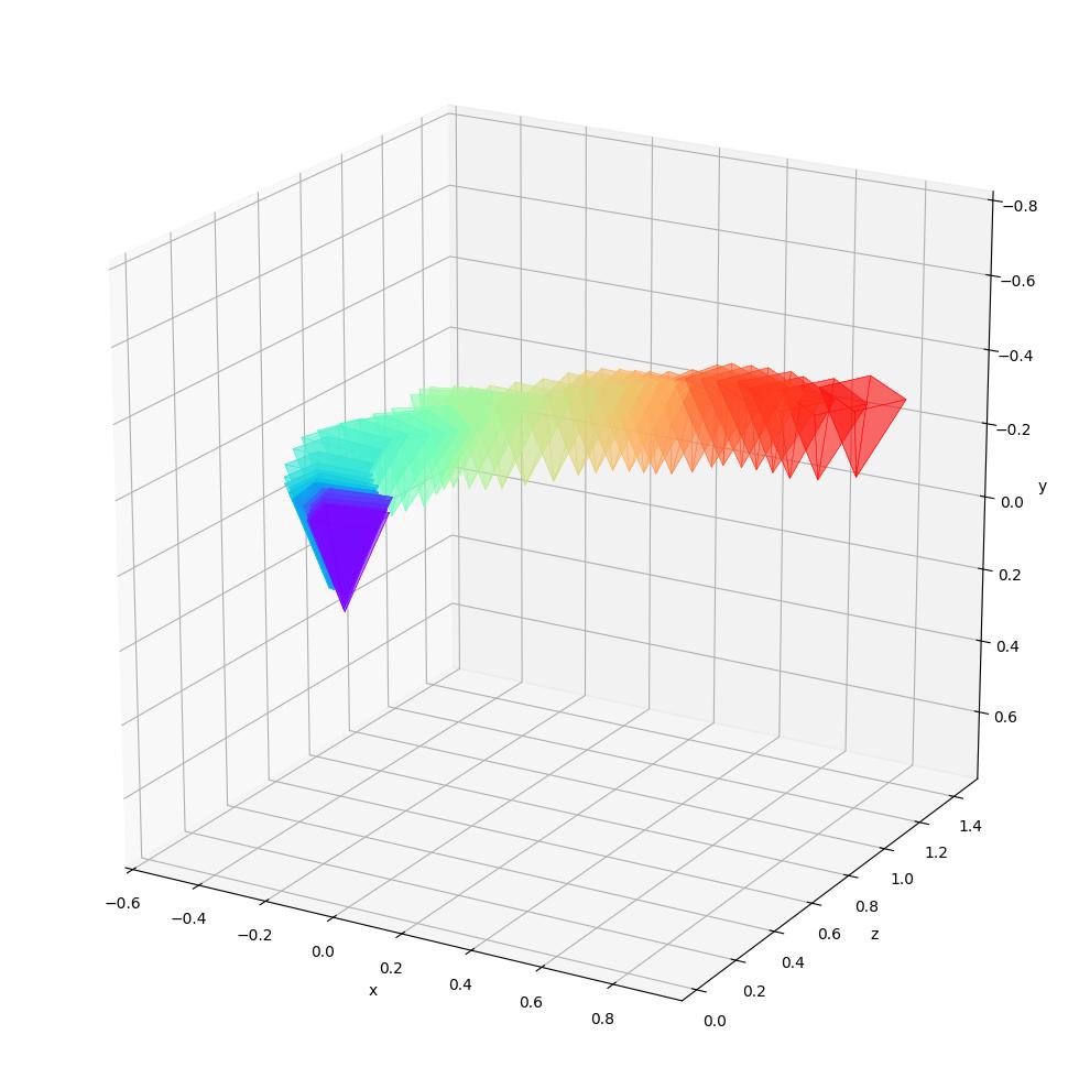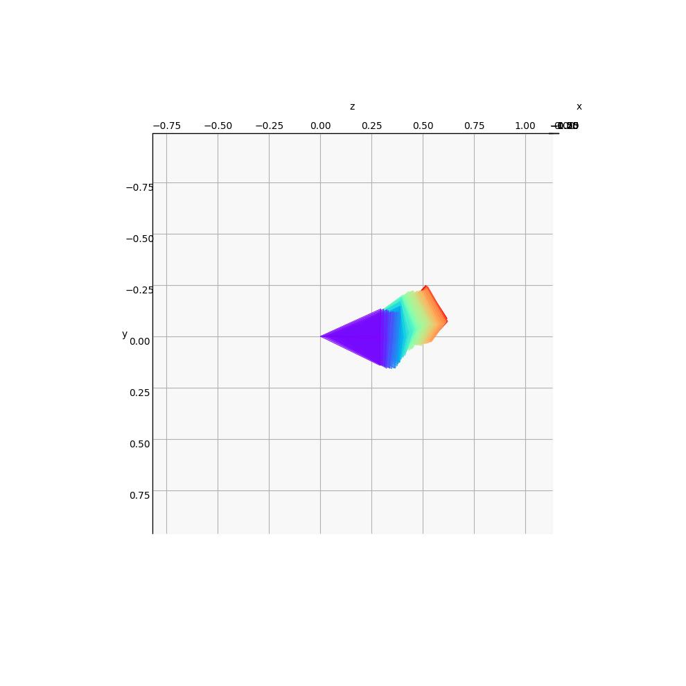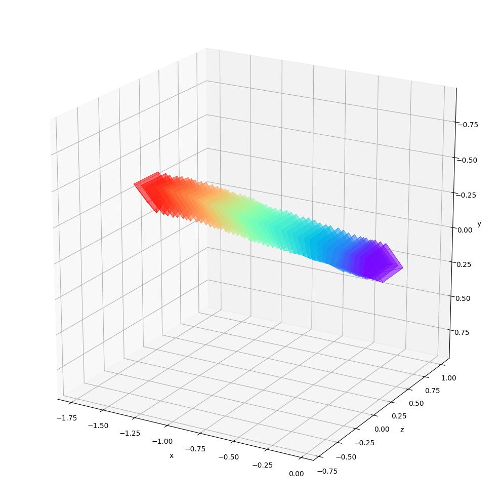 The cameras are color-coded to represent their position in time: the first camera is purple and the last one is red.