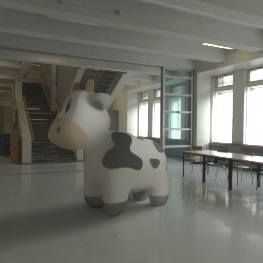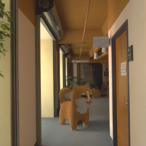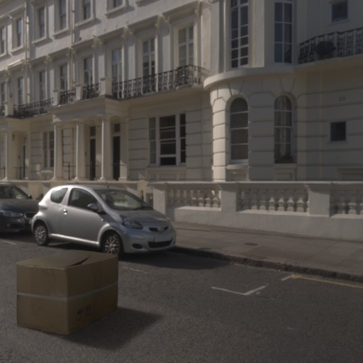 Both DiLightNet and Neural Gaffer require an environment map for lighting. We construct such an environment map with radiance \(L_{\text{env}}\) along direction \(\omega\) defined as the sum of a spherical gaussian and a constant term \begin{equation} L_{\text{env}}(\omega) = \mathbf{c}_\text{light} e^{\lambda (\omega \cdot \mathbf{v} - 1)} + \mathbf{c}_\text{amb} \,, \end{equation} where \(\mathbf{c}_\text{light}\) and \(\mathbf{c}_\text{amb}\) are the RGB colors of the light and ambient terms resp., \(\mathbf{v}\) is the dominant light source direction, and \(\lambda\) is the bandwidth. \(\mathbf{c}_\text{amb}\) is obtained by computing the average color over the background image. Panoramas from the Laval Indoor HDR dataset (excluding those in our test set) are used to estimate a single average intensity of the dominant light source, \(k\), which is set to the ratio of the integral of the brightest pixels in the panoramas, divided by the integral over all pixels. We further divide this integral by 2 to consider a single hemisphere and avoid overly bright dominant light sources. The light color is defined by \(\mathbf{c}_\text{light} = k \mathbf{c}_\text{amb}'\), where \(\mathbf{c}_\text{amb}'\) is the normalized ambient color \(\mathbf{c}_\text{amb}\). We found that the bandwidth parameter \(\lambda\) did not advantage any specific method and therefore fixed it to \(\lambda = 300\), which we typically observe for an indoor light.